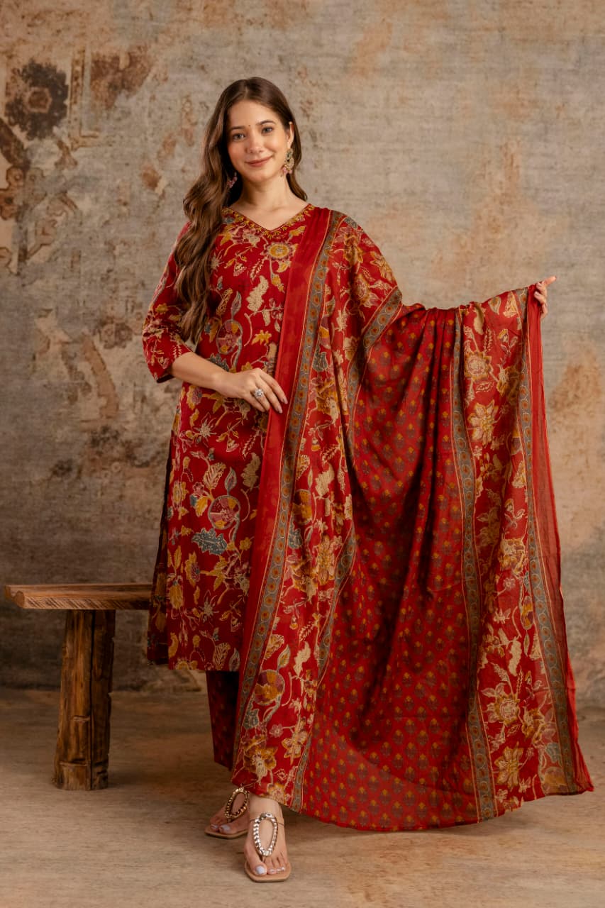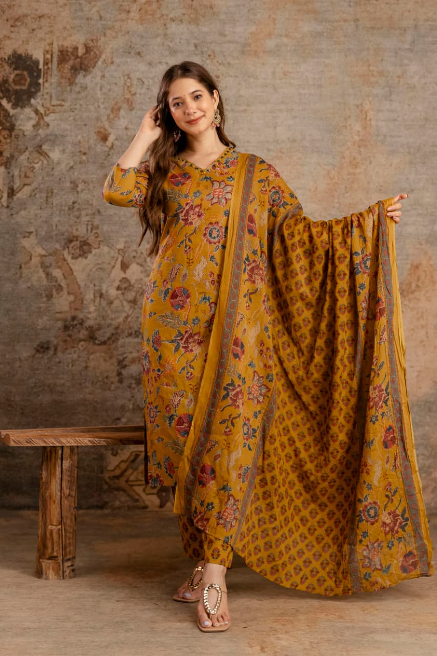 The kurti showcases a floral print design with intricate detailing. Pair it with the matching bottom and printed dupatta for a complete traditional look. Wear it for casual outings, festive occasions, or office wear, and enjoy the perfect blend of elegance and comfort.