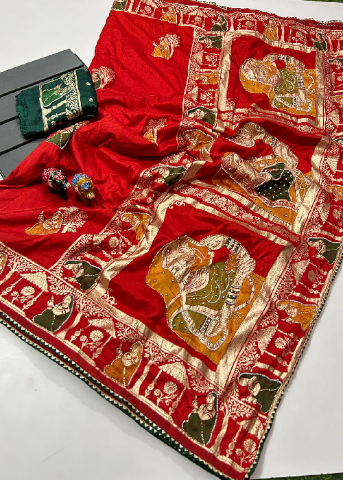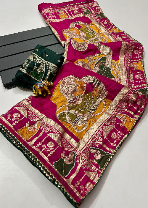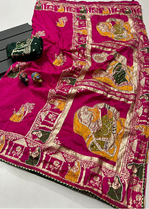 Elevate your festive look with our Pure Dolla Silk Saree, crafted with luxurious Meenakari Zari Weaving and adorned with Kutdana, Moti & Stone Handwork. This stunning saree is designed to bring elegance and tradition together, making it a perfect choice for Karwa Chauth, weddings, parties, and festive celebrations.