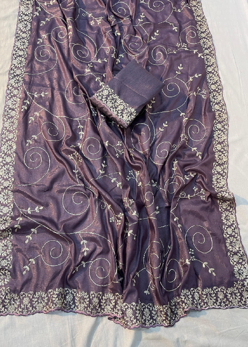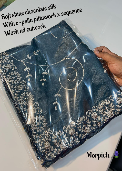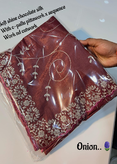 Elegant Chocolate Silk Saree with heavy C-pallu pitta work, delicate sequin & cutwork detailing. Paired with a rich embroidered mono blouse (unstitched). Perfect for weddings, parties & festive occasions