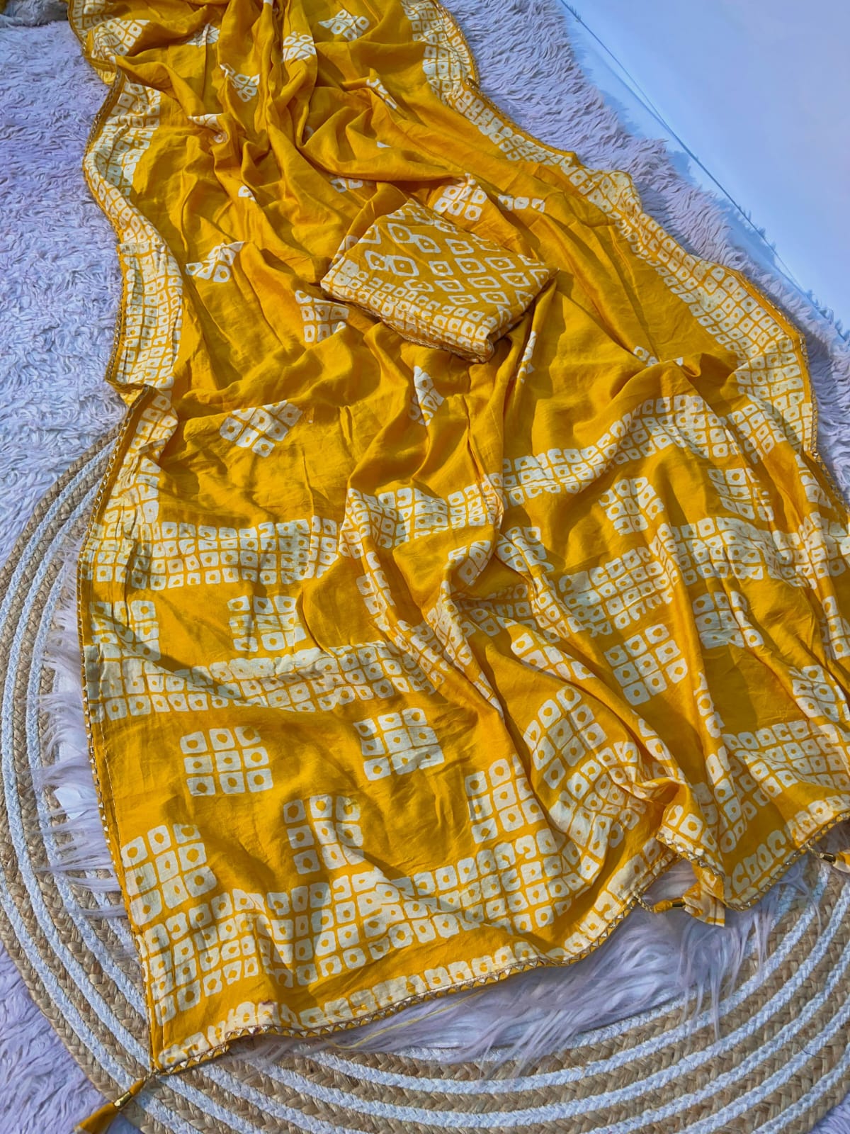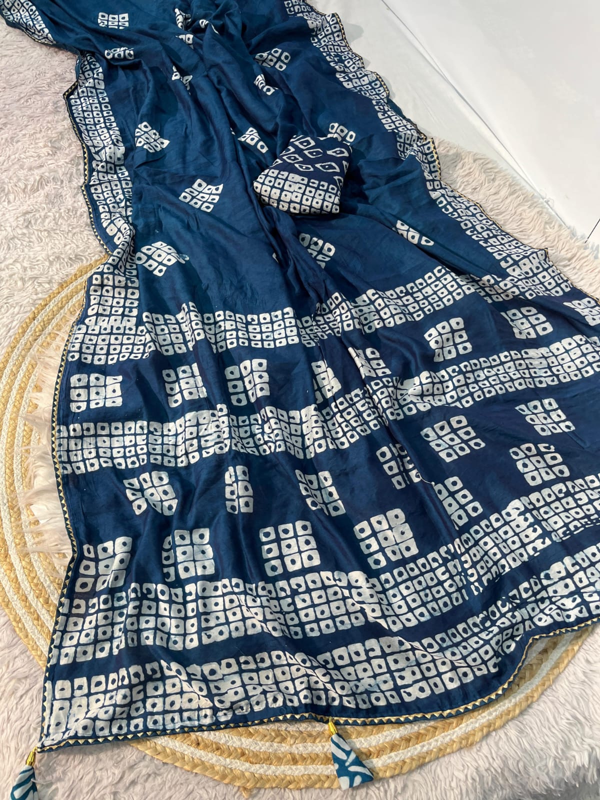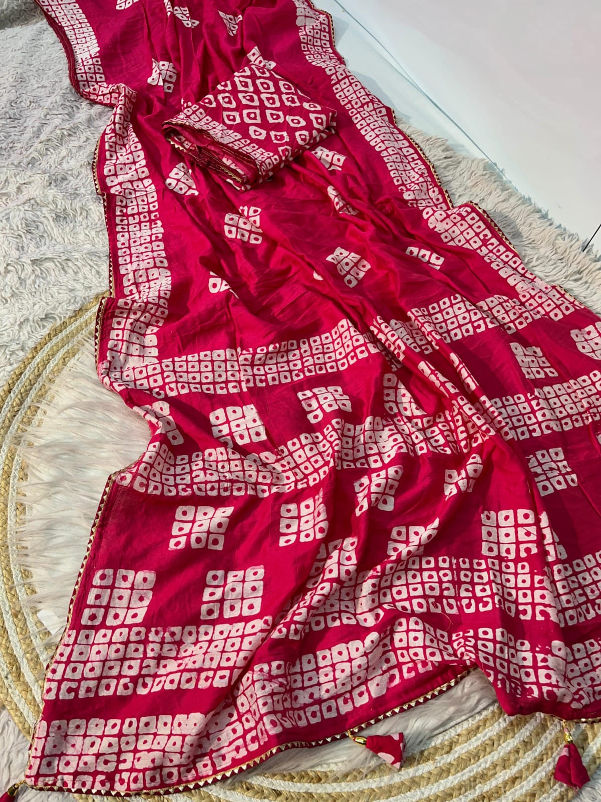 Soft Mulmul Cotton Batik Saree with elegant tie-dye print, contrast border & latkan. Comes with running batik blouse. Available in 6 beautiful colors